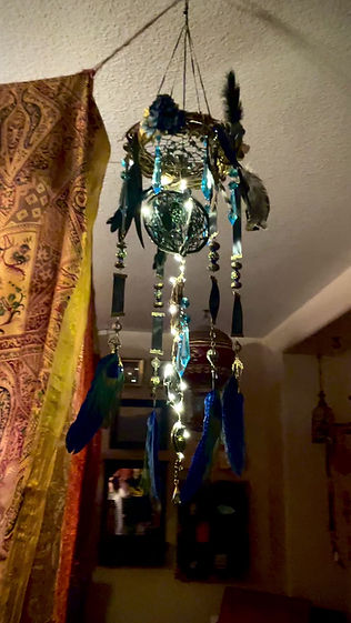 This piece I made from a tree branch I found in nature. I added dried eucalyptus branches, satin ribbon and bone beads from Africa. The piece is very aromatic from the dried herbs.